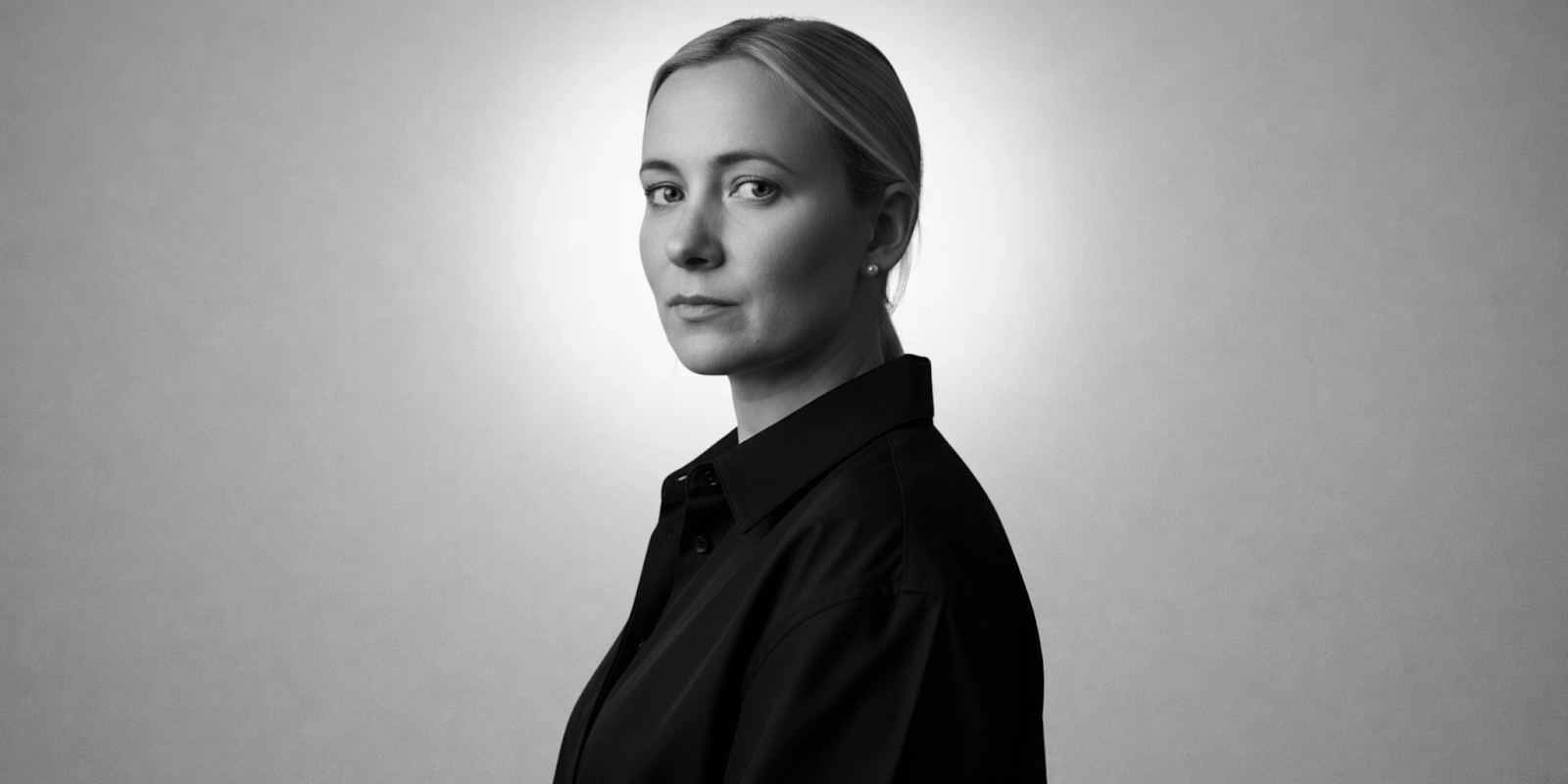 Black-and-white portrait of woman in dark shirt, looking over shoulder against plain background.